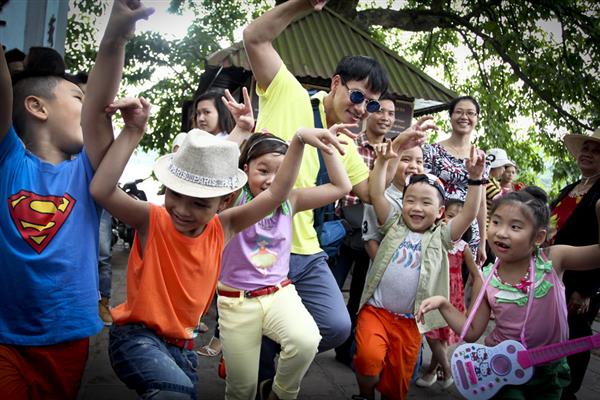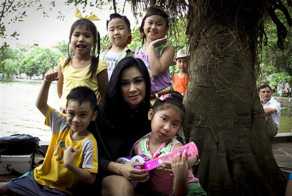 Chú Xuân Bắc đùa nghịch, tạo những kiểu dáng chụp ảnh độc đáo như “chân gà rút xương”, “sủi cảo mì hoành thánh” cho các bạn nhỏ bắt chước.
